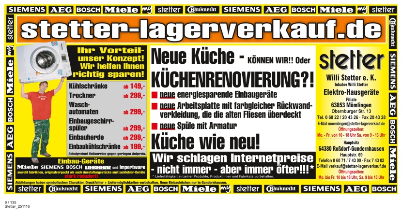 Ich freue mich Sie bei meiner Firma Stetter als Spezialist für günstige Hausgeräte und Küchen begrüßen zu können. Bitte informieren Sie sich auf unserer gut strukturierten Internetpräsenz über unser Unternehmen und unsere Leistungen. Wir stellen Ihnen in unseren Geschäften eine große Bandbreite an Elekrogeräten zur Verfügung, aus der Sie ganz nach Ihrem Geschmack wählen können und bei Bedarf unterstützen wir Sie gerne mit einer fachlich kompetenten Beratung oder sind für Sie mit unserem Kundendienst da wenn es mal klemmt.